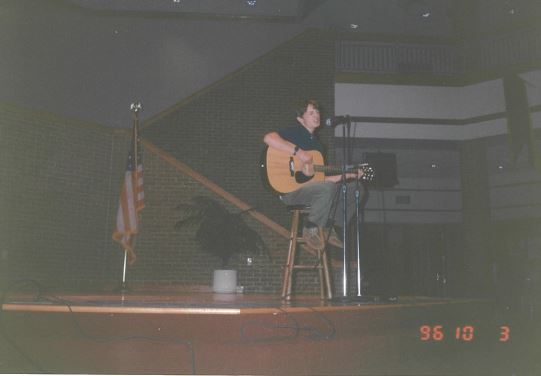In the student center of Indiana Wesleyan University, with equal parts swagger and stage fright, I debuted to the world. My Dad’s old classical guitar, which I brought to college, had broken tuning knobs. So I borrowed a new guitar from a girl named Lora. But another girl, who had a crush on me, named Elizabeth, took the picture above. She used her Panasonic dual-tape deck to make an audio recording of the song I played: an original called “Open Road.” To my amazement people liked it. Participants were supposed to only do one song, but in the applause I asked “Do we have time for one more?” The sound engineer nodded and I followed up with R.E.M.’s “The One I Love.” It didn’t bring down the house, but it lifted my spirits.