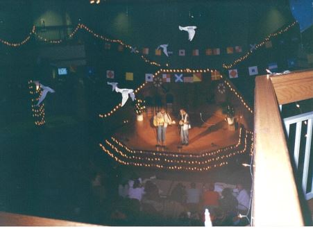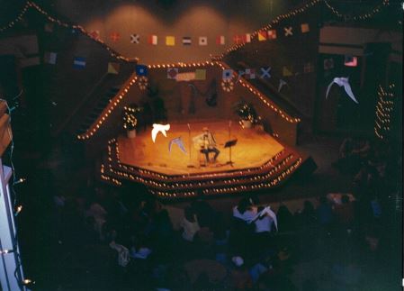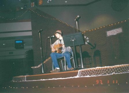 Another Student Center Talent Show. As you can see it was a nautical theme. Eschewing any Margaritaville-like excess, Daniel and I were serious folk-poets with a social-spiritual consciousness. Our entry was a song we co-wrote and co-fronted called “Cold.” It was a minor-key exploration of homelessness; how easy it is to look the other way, and our own guilt of apathy. We didn’t steal the show, but a few people were paying attention.