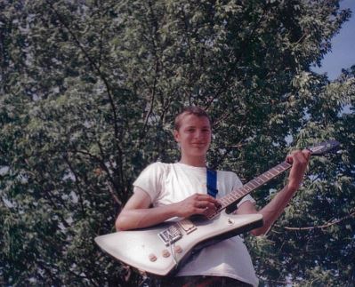 Jamming outside Bill Hall, where we lived. (L-R) Me, Dave Mason, who cofounded the Spotted Cow festival with me the next year, Daniel, and Jason Dean – local guy, almost in the band for a minute – taught me my first blues riff.